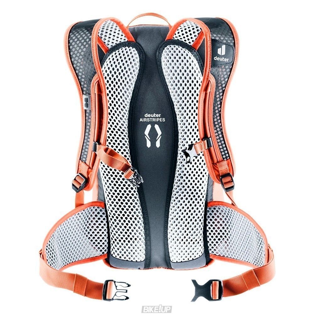 This pared down bike backpack with good weight-to-comfort ratio benefits from the breathable deuter Airstripes back system. Providing athletic mountain bikers with good airflow across the back and a snug fit for technical trails. A sternum strap and mesh hip fins give the pack additional stability. With bluesign® approved body fabric made of 100% recycled materials and components made using environmentally friendly, resource-efficient manufacturing practices, the Race meets the highest environmental standards and is climate neutral, and PFC free.